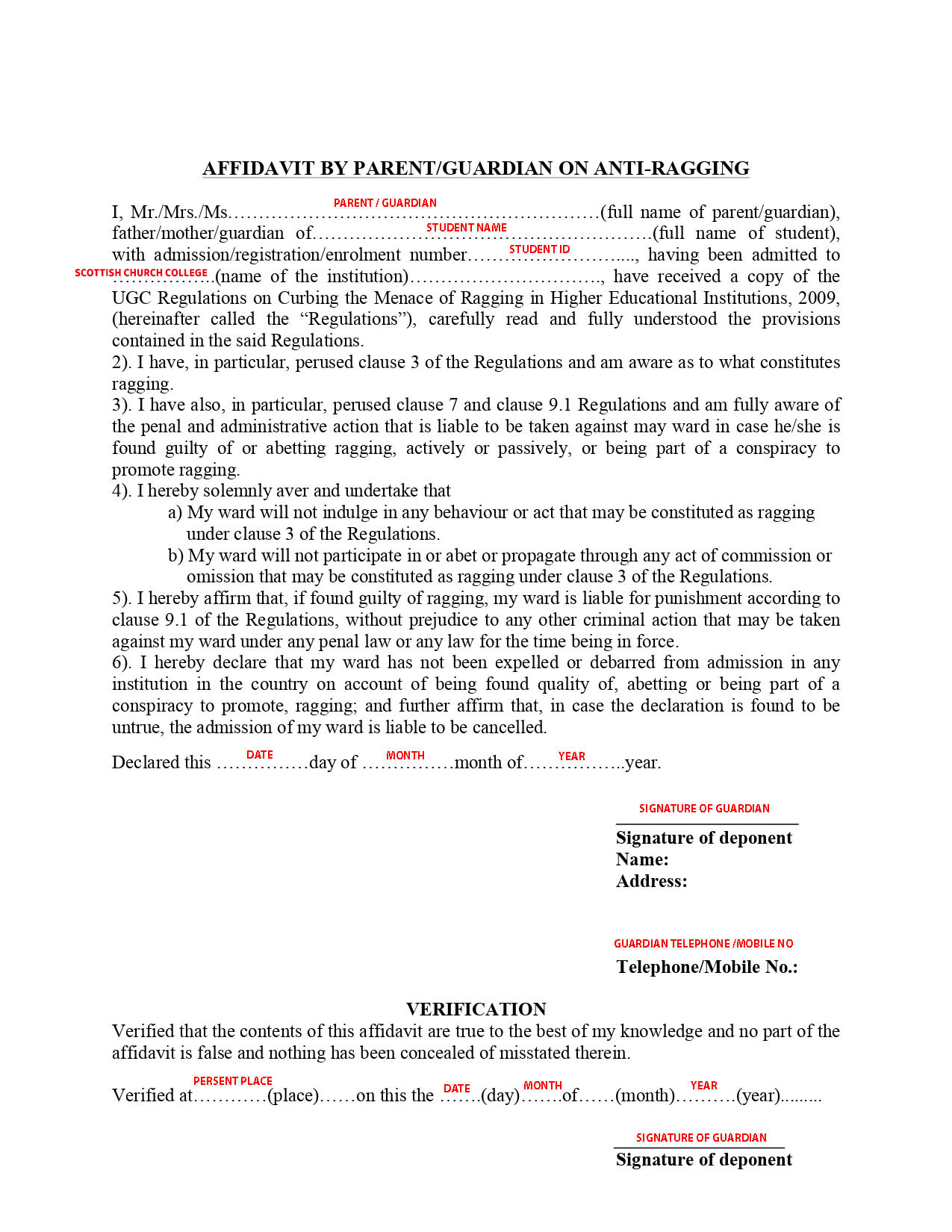 New | FORMAT / SAMPLE for Affidavit by Parent / Guardian on Anti-Ragging | Format Sample | |