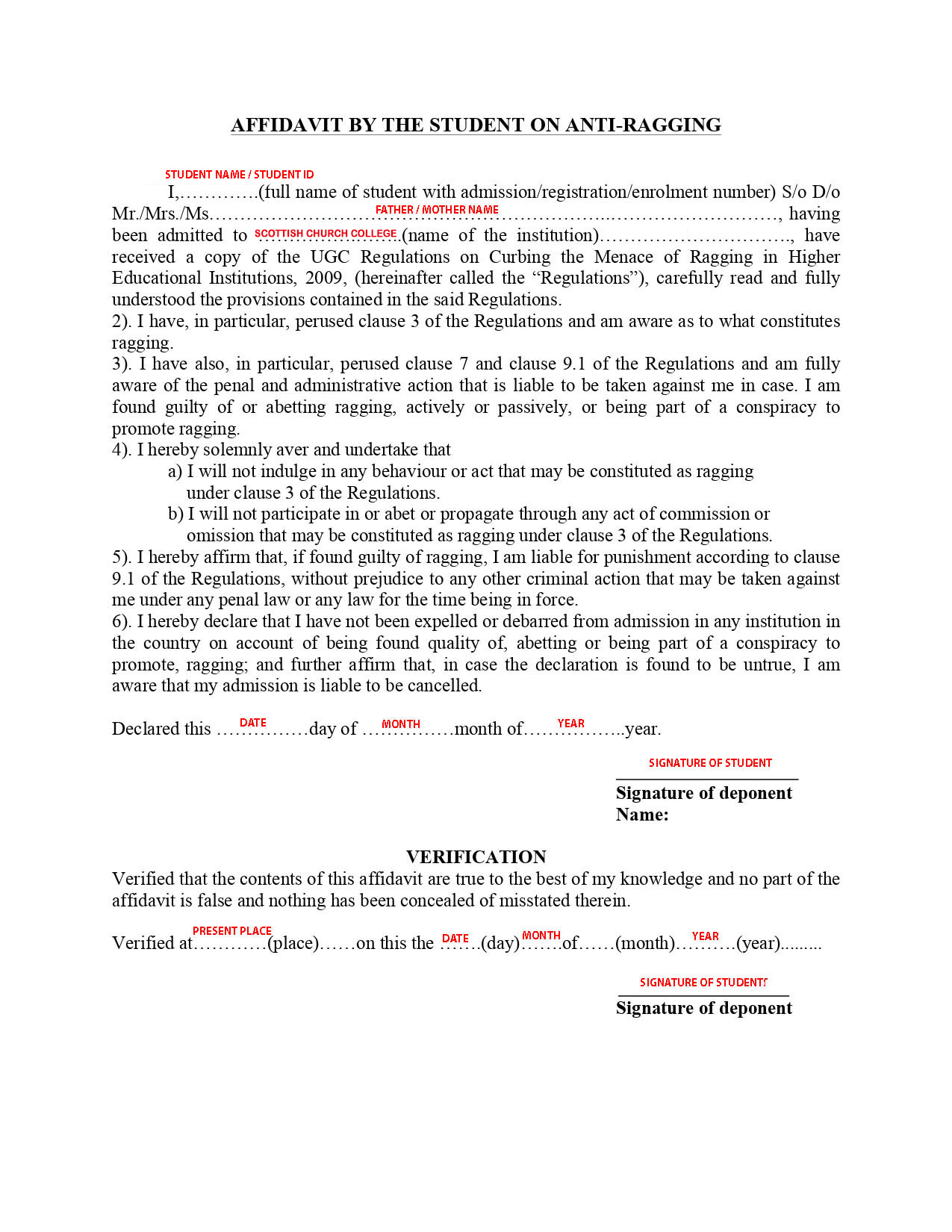 New | FORMAT / SAMPLE for Affidavit by The Student on Anti-Ragging | Format Sample | |